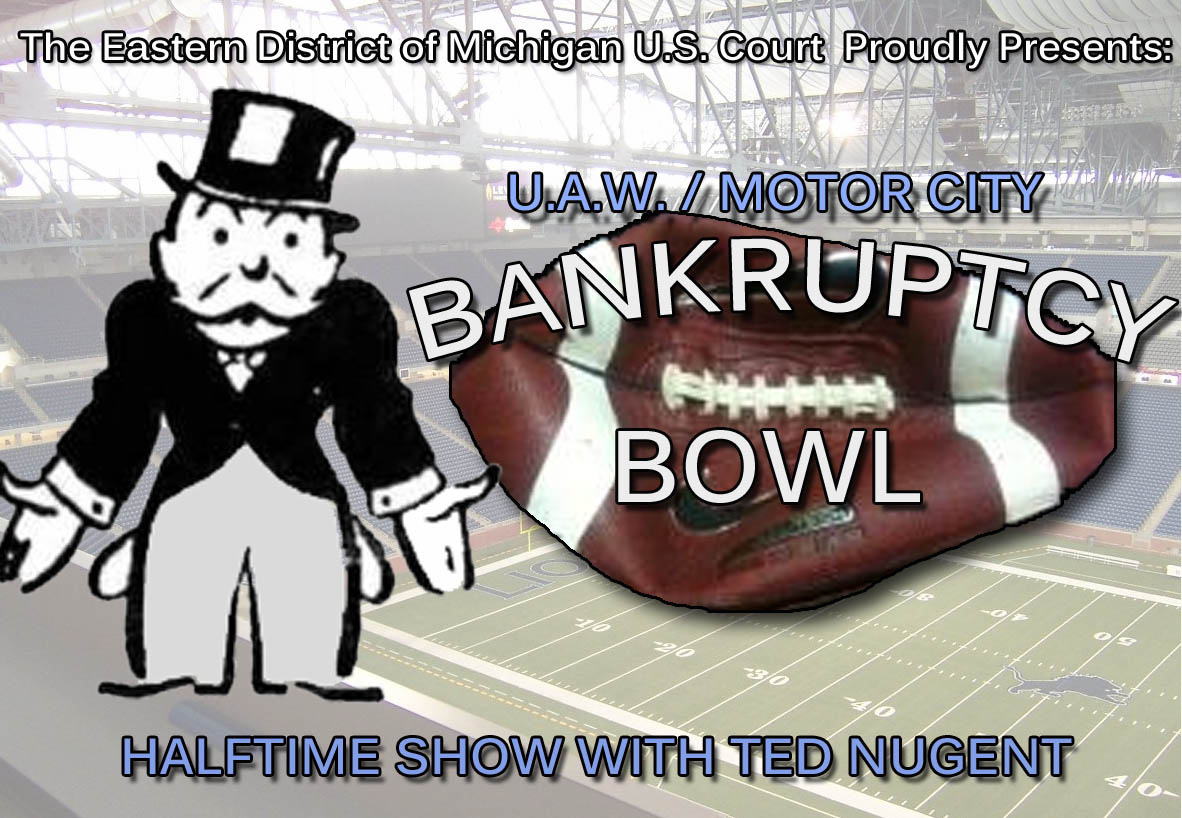 – a can of spray paint to sign “___ was here” on the municipal building of one’s choice. - Residents of Detroit will vote for the 2 teams that they want to be in the Bankruptcy Bowl, but the State-appointed City Manager will ultimately pick the two teams of his choice.