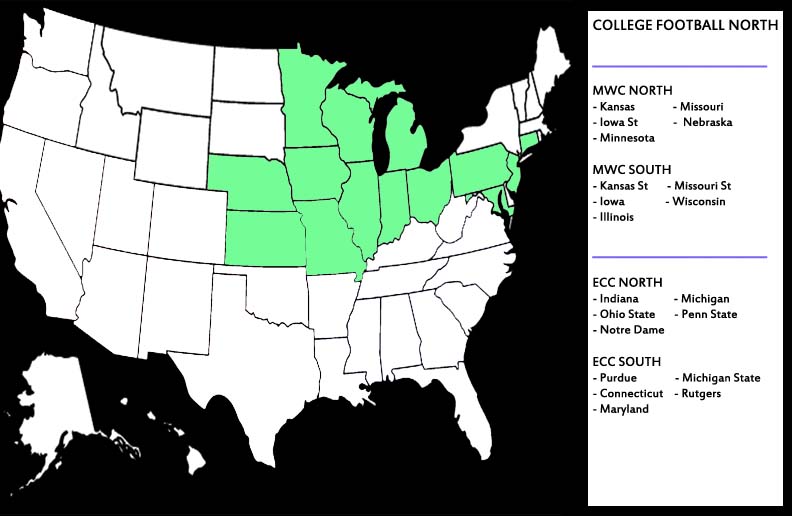 Yes, that is Maryland up there with all those Big Ten schools. Why not? That’s where they apparently want to be. The set-up of College Football North preserves a lot of your traditional Midwestern rivalries. Ohio State-Michigan is still there. Kansas-Missouri is still there. Even Maryland-Rutgers. Oh wait, no one wants to see that. But like the other two conferences, it’s not quite perfect, but easily imagined in a new era of college football. If we’re moving towards an official NFL feeder league model, and that seems to be the case no matter how slowly it comes about, then these divisions would be high on the list.