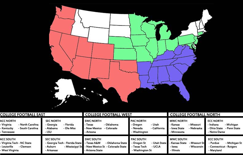 Sure, this is a little more of a stretch, but a lot of great teams out west ARE private schools so concessions had to be made. Stanford is gone. BYU is gone. Even Southern California is gone (which is hard to believe). Keeping that in mind, we again have compact divisions that make perfect sense. Close, geographic rivals, easy travel, exciting matchups. The only real outlier is Texas Tech which got the short end of the stick being the ‘third’ program out of Texas’ public school group. Some things can’t be helped. Regardless, College Football West is still a formidable group, featuring regular heavyweights and setting up exciting playoff matchups (imagine a SWC North- Texas vs. a PAC North- Oregon in the College Football West final? Priceless).